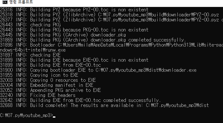정상 실행 확인후 윈도우 실행파일 만들기